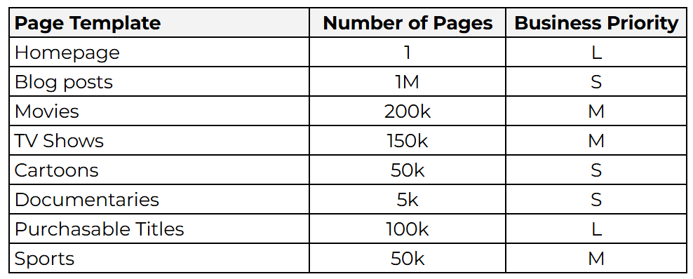 Let's say you have a streaming service business and you want to do a technical audit for the website. Page templates may look something like this