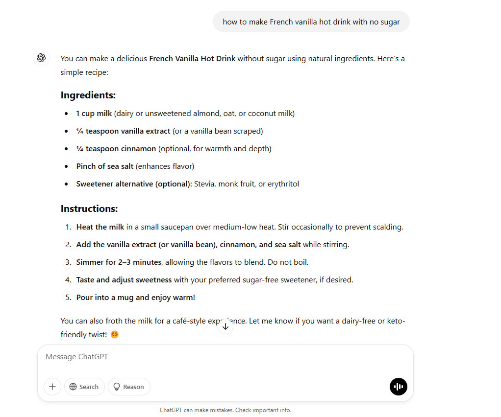 I tested how both Google and ChatGPT handle a specific query: How to make French vanilla hot drink with no sugar?