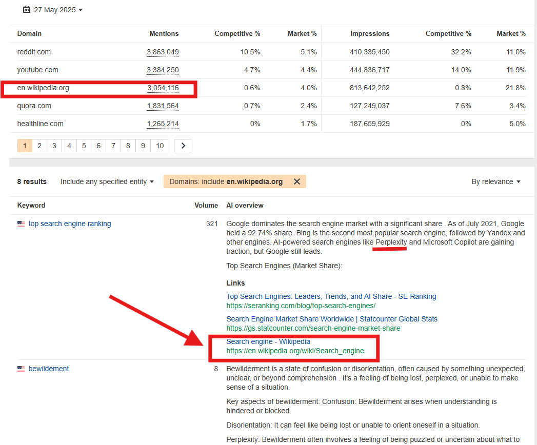 Healthline: if I were perplexity, I would check why I am getting cited/mentioned on Healthline, and learn from that. You can easily do that with the Brand Radar Tool by Ahrefs. For example, I clicked on Wikipedia mentions, and I got a list of AI Overviews where a Wikipedia URL that mentions "perplexity" was cited in AI Overviews!