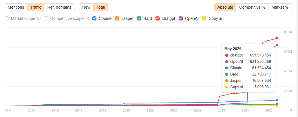 Another interesting insight is that more mentions of your brand are not necessarily correlated with more traffic! Looking at this example, I decided to compare "chatgpt" and other LLMs traffic vs mentions.