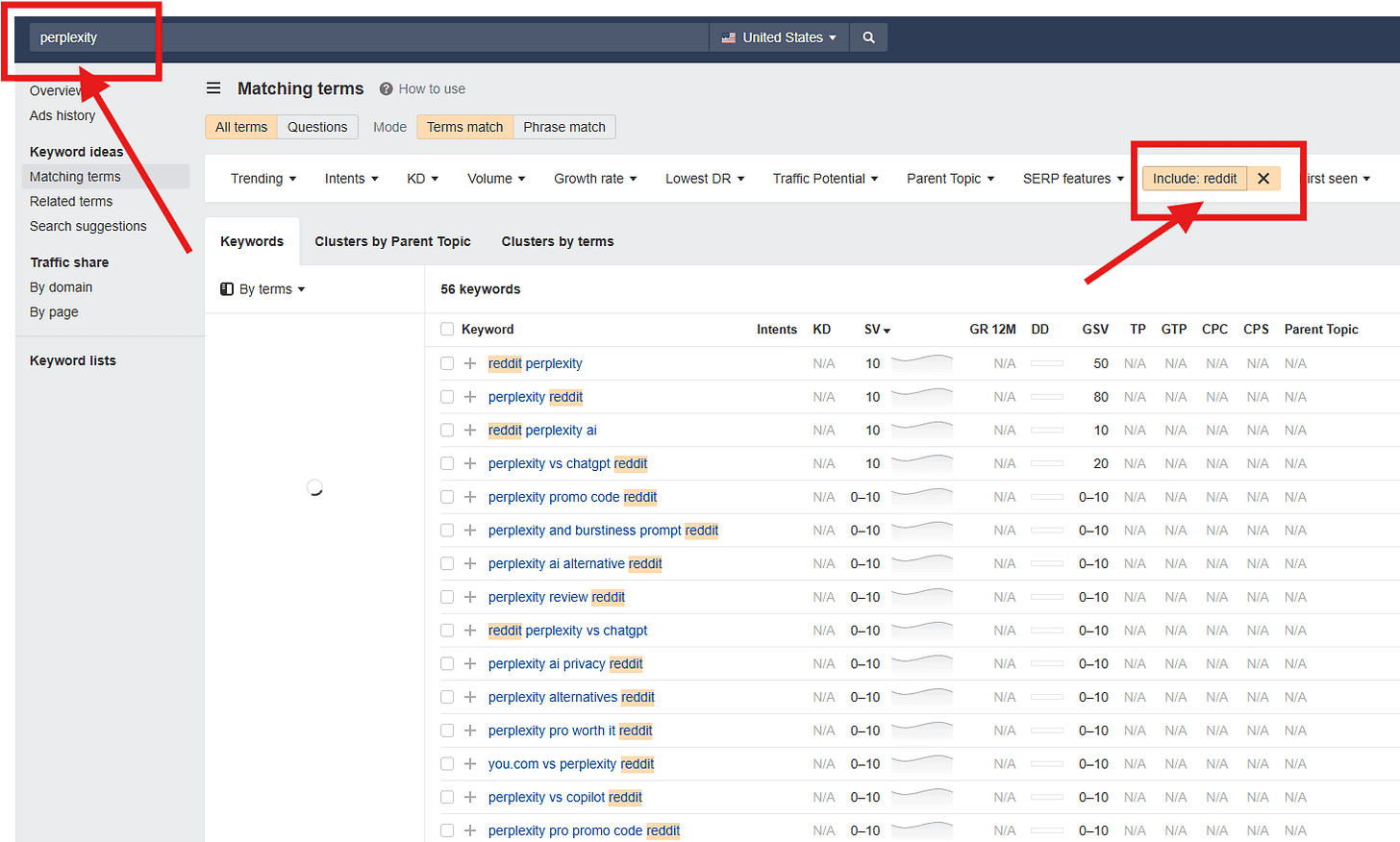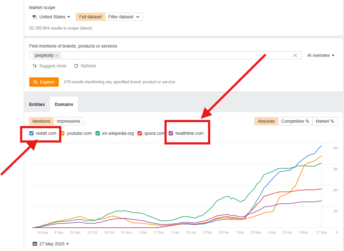 Let's look at "perplexity" as an example. I'm using the Brand Radar Tool by Ahrefs, take a moment to check it out! It's very interesting to see that healthline.com is one of the top websites mentioning perplexity as a brand... Also the usual suspect comes on top, Reddit.