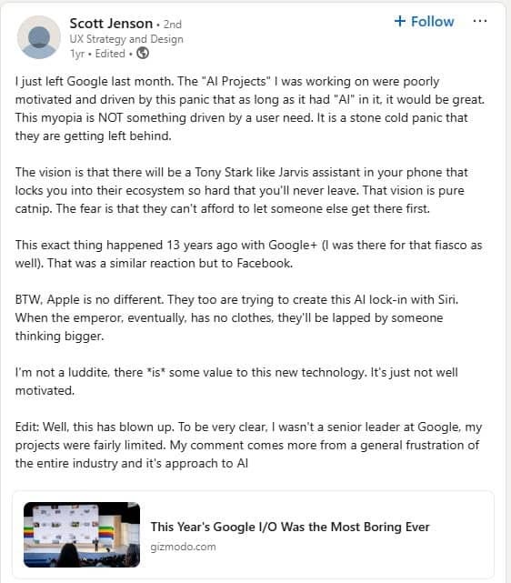 Obviously AI Mode is all the latest hype and with it comes a lot of speculation on the future of search. I think the scary part is learning (and knowing) that the changes Google is introducing to search with AI are not well thought, or based on user needs. They're just in panic mode trying to stay relevant. What's even worse is when an ex senior UX designer at Google compares this with what happened 13 years ago with Google+... we all know how that ended 😏