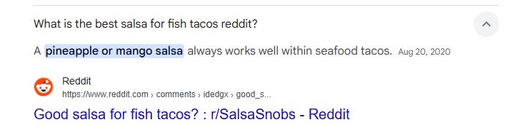 I came across this interesting “people also asked over the weekend, and I'm testing going after keywords with [reddit] modifier, but checking out the related subreddit and comments, and summarizing them. Test will be live today on LinkedIn, let's see if this works! So what I'm trying to say is, you can experiment with going after those keywords in the content on your website as well!