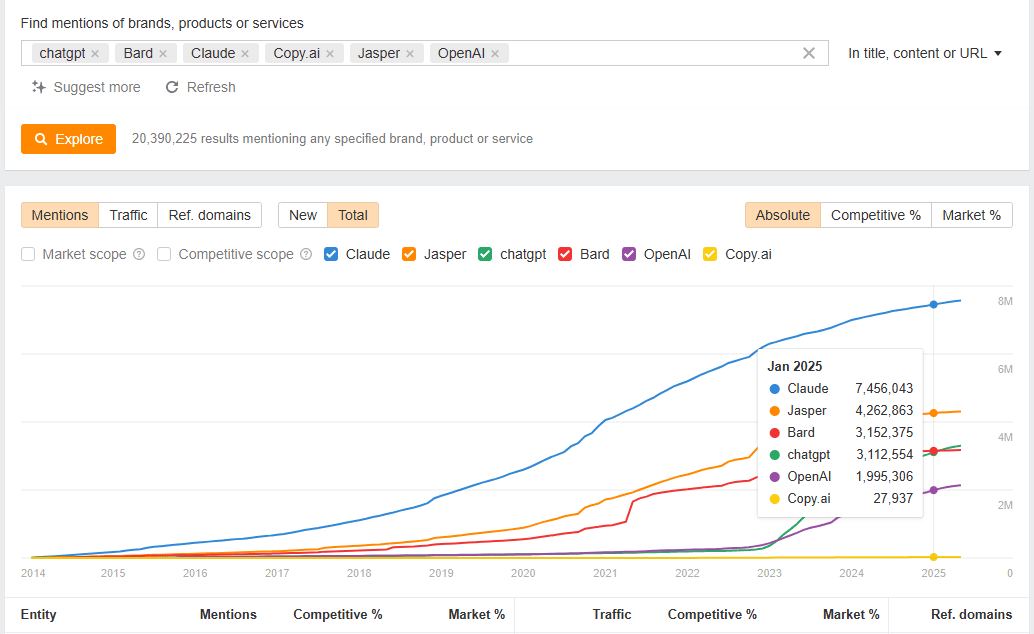 In this graph you'll see that Claude has the highest number of brand mentions online. It delivers better output than chatgpt btw for coding exercises sometimes!