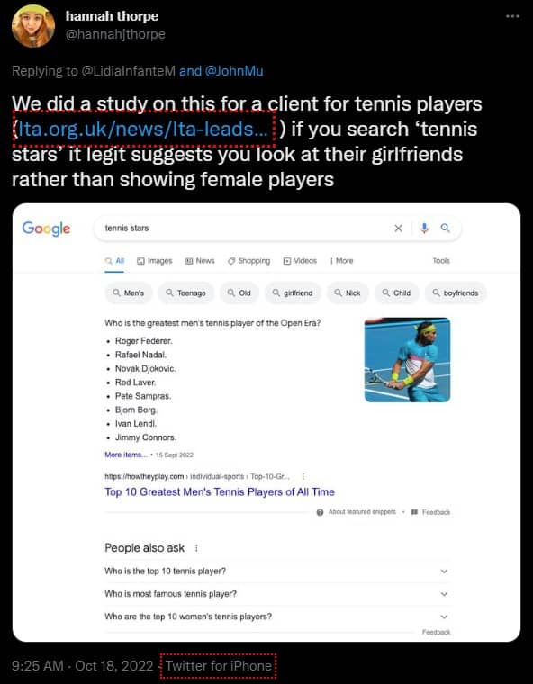 Within the ‘People Also Ask…’ section (those results surfaced as being related additional queries people go on to search), for the first four options provided for each query, 236 of 256 slots related to content surrounding male players, dominating 92% of the immediately available People Also Ask results