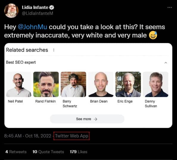 I mean it's a legitimate comment! Why is a search for "SEO Expert" returning an all male list given that there are many successful female figures in the industry?