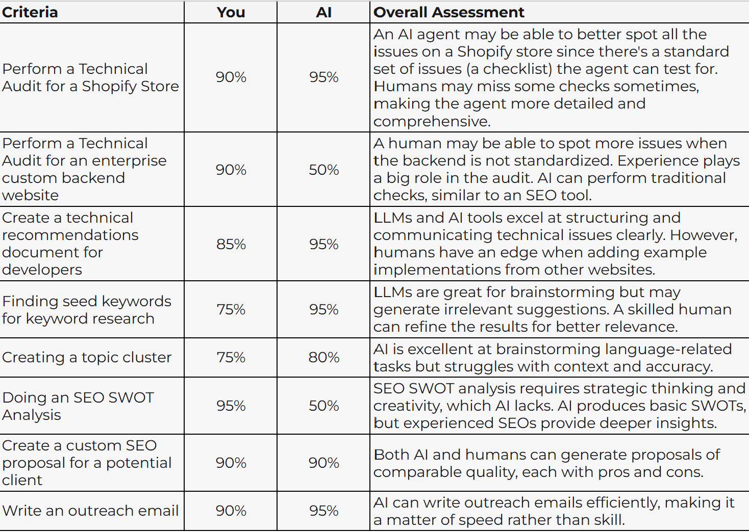 As you can see in the table above, I do believe AI can outperform a human SEO with 5 years experience in SEO. Why? Let's chat about some of the examples above, but keep in mind, this is my opinion (maybe I'm wrong who knows 🤷)