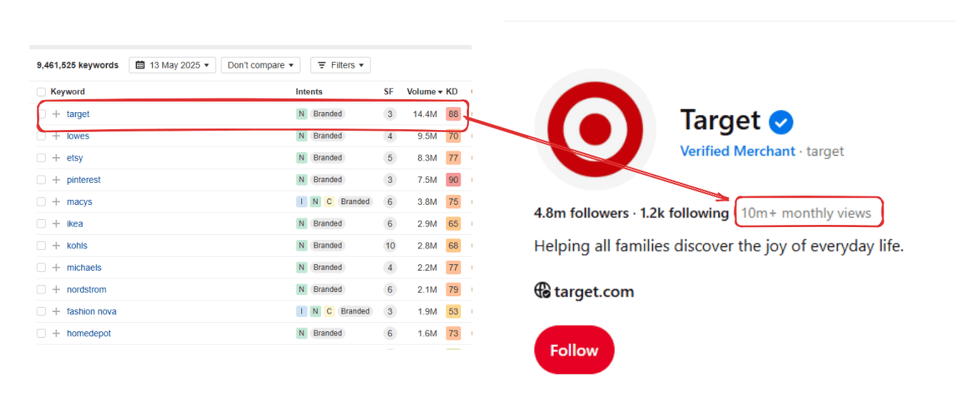 I checked the Ahrefs organic keywords report for Pinterest keywords on the first page, and found that the top keywords by search volume is for brands! I then looked at how these brands are performing on Pinterest. Target is getting 10M monthly views on their Pinterest account!