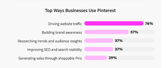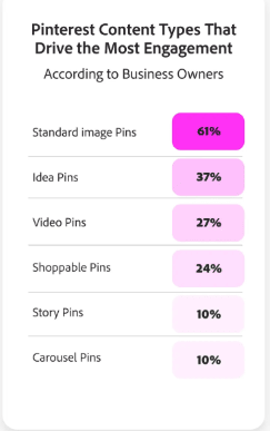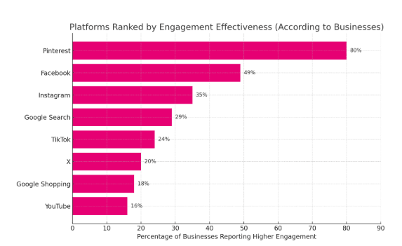 Platform engagement rate. Pinterest is one of the top platforms in terms of engagement! In the Adobe study, 80% of businesses that use Pinterest say it outperforms other platforms in keeping consumers interested and interacting with their content. Specifically, businesses found it more effective than Facebook (49%), Instagram (35%), and Google Search (29%) for driving actions like saves, clicks, and shares... just wow!