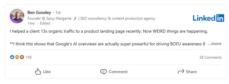 I like how Ben Goodey found value from getting cited in AI Overviews and it has to do with your brand!