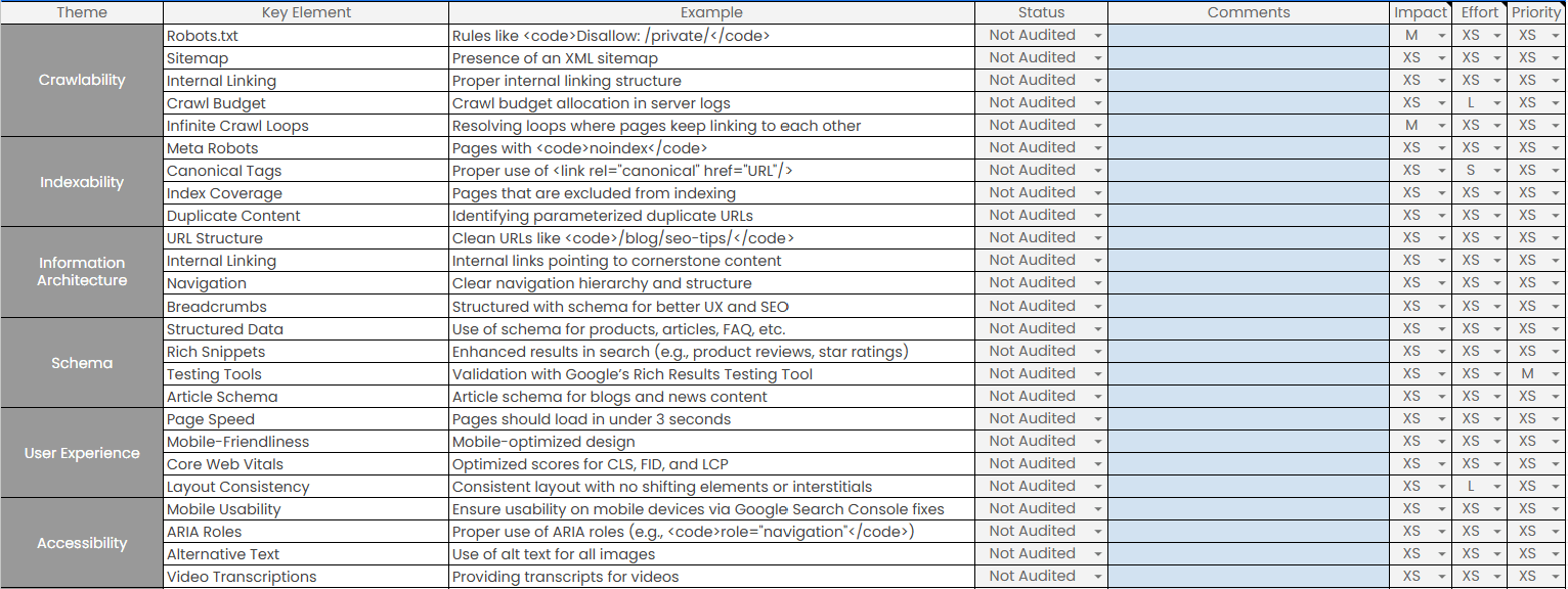 So, the idea is similar to auditing by priority, every month or sprint for example, you can audit for a specific theme. This way you are spreading your tech audit across a more reasonable time that allows you to dedicate more attention to each audit theme.