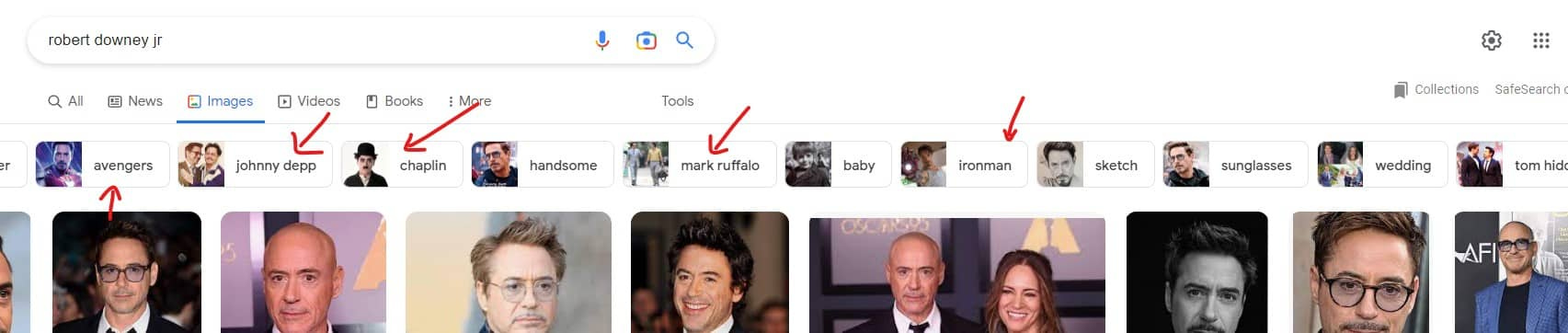 If you use Google image search for "Robert Downey Jr" you'll see google suggesting plenty of related entities based on Google's knowledge graph. Here's what I got in Google image search: