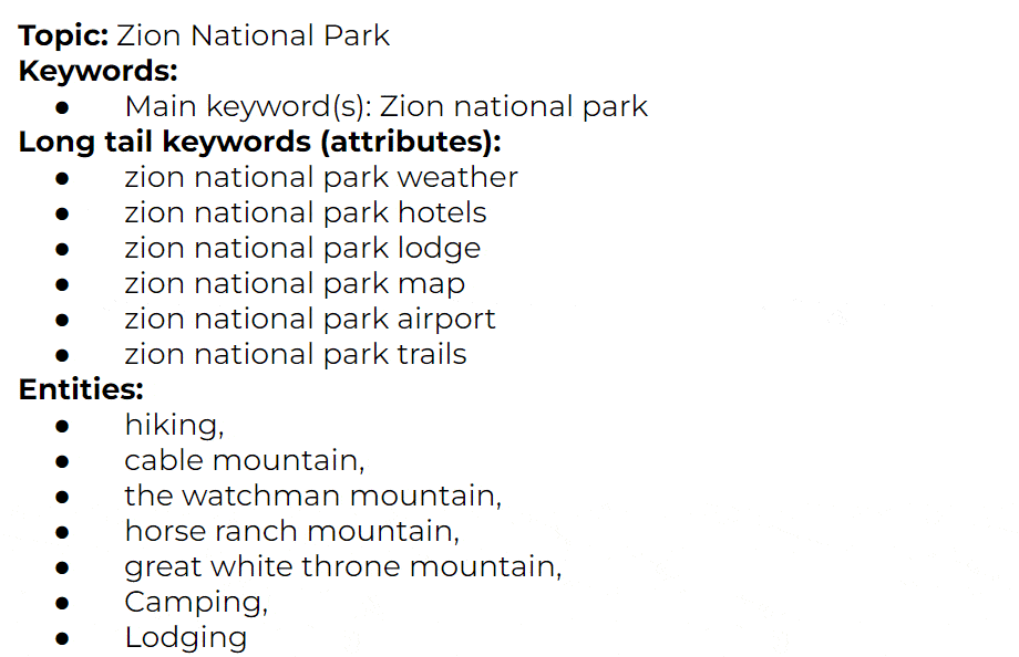 For this example, let's say we want to address "Zion National Park" first. We decided that this topic can be covered with 1 blog post. Some topics may require multiple blog posts. For example if your topic is "SEO", it's very challenging to cover that in one blog post.