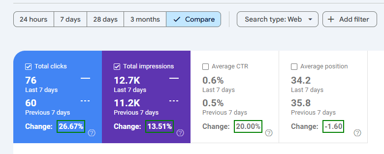 For example, look at this screenshot from GSC (I used Agital chrome extension to automatically calculate the percentage change)