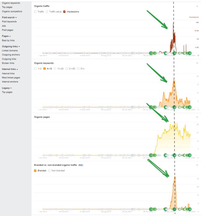 A perfect example is using the Ahrefs Webmaster Tools Dashboard here. In the screenshot, you can see that there's an increase in organic traffic, that's aligned with an increase in the number of organic keywords, which is NOT due to an increase in the number of pages, but rather due to an increase in branded searches!!!!