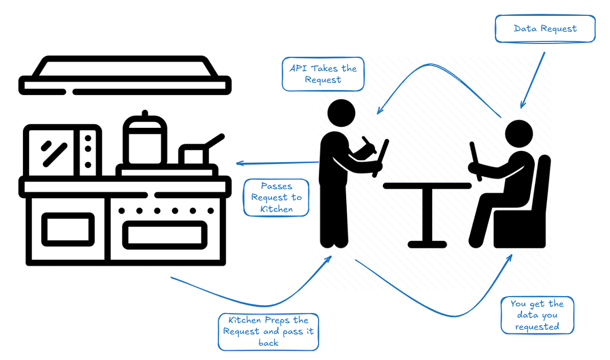 An API is like a waiter, that takes your request (what data do you need) and passes it to the kitchen to prepare it for you, and once ready, takes your order (the data) and delivers it to you.