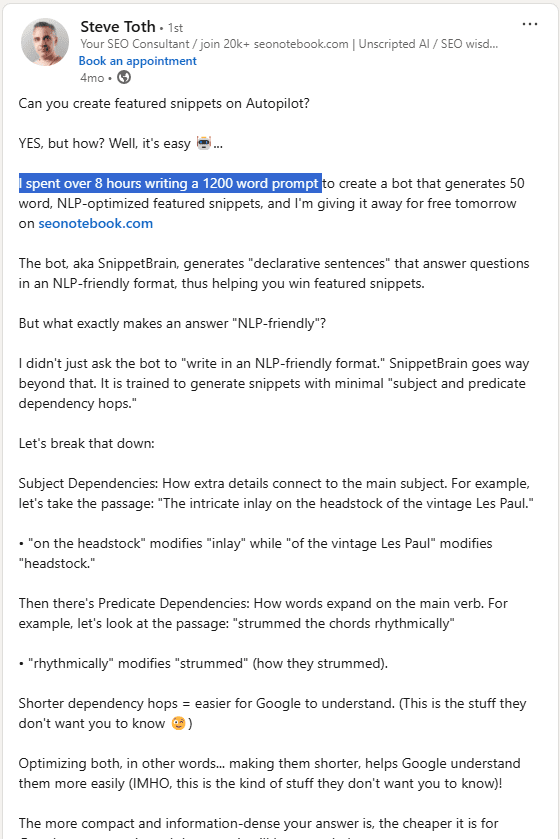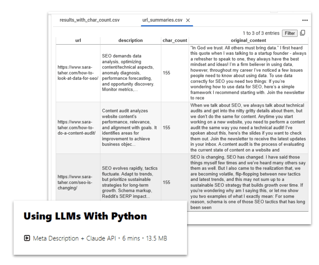 I have created a python script that uses Claude API as part of my python course to write meta descriptions in bulk. This is a time saver! Think of other things you can in bulk? You're literally one skill away from automating your work.