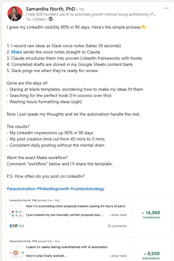 Here's an example of a cool workflow that Samantha North built! If she enables the AI to post on her behalf, then she has created an AI that actually does the job in full.
