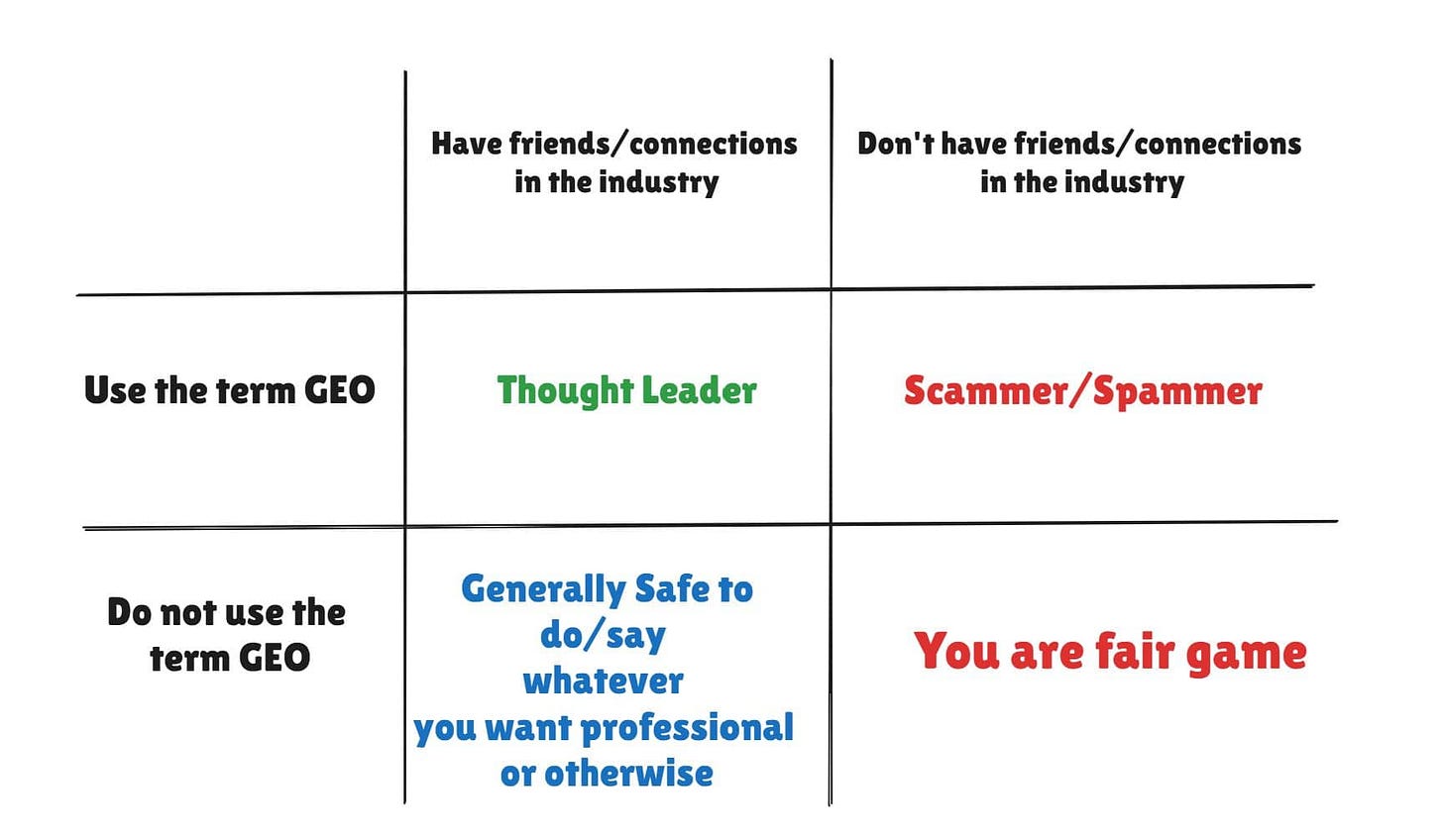 And let’s talk about fairness. Why go after small creators who mention GEO, but stay quiet when big players do the same? Because you don’t want to upset your friends? 😄 That double standard is the real problem.