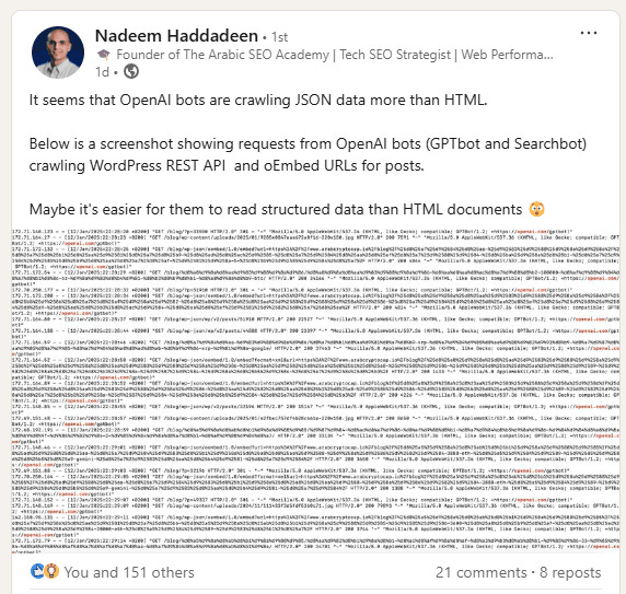 we have few tests and observations. For example, I shared this before: Nadeem Haddadeen on LinkedIn. Nadeem noticed that Open AI bots are crawling JSON data more than HTML.