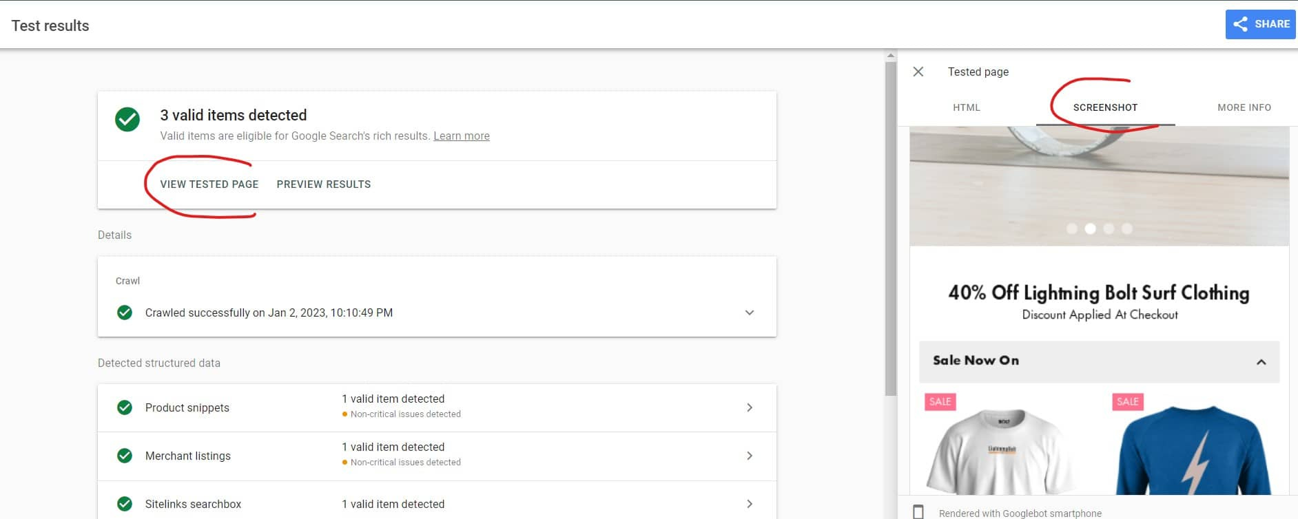 Click on "screenshot" and you'll be able to see what can Google see on a page and what not. To overcome the limitations of infinite scroll, one option would be using paginated loading.