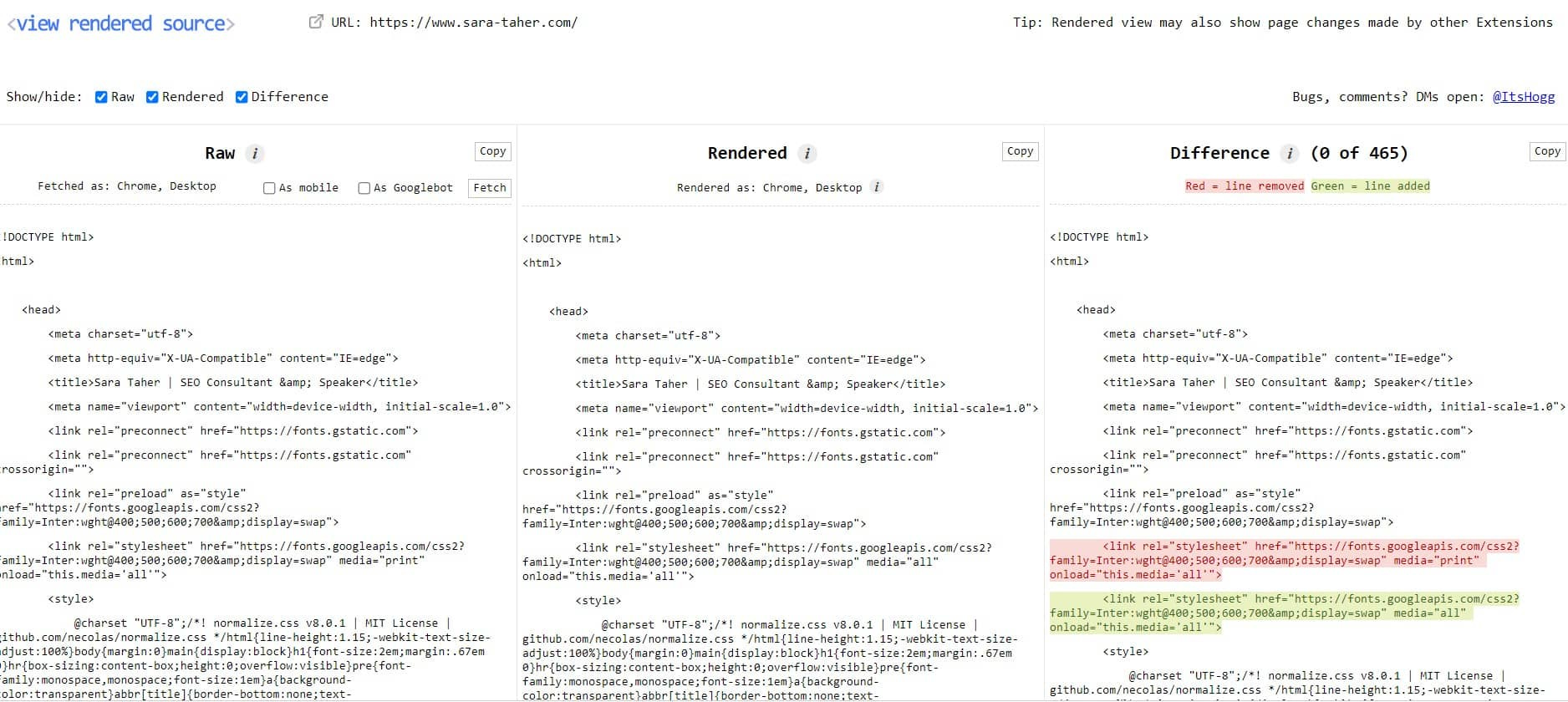 View Rendered Source Chrome Extension: this tool shows you the raw html, the rendered code (after JS is executed) and the difference between the 2.