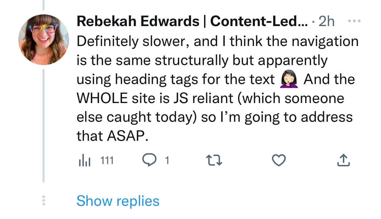 In fact just today, I stumbled upon those tweets from Rebekah Edwards asking about a website that saw a significant drop in performance after a redesign. While having a temporary drop in redesigns is not unusual, she noticed that the performance is steadily declining which is alarming. After some discussions, she found that the website is JavaScript heavy.