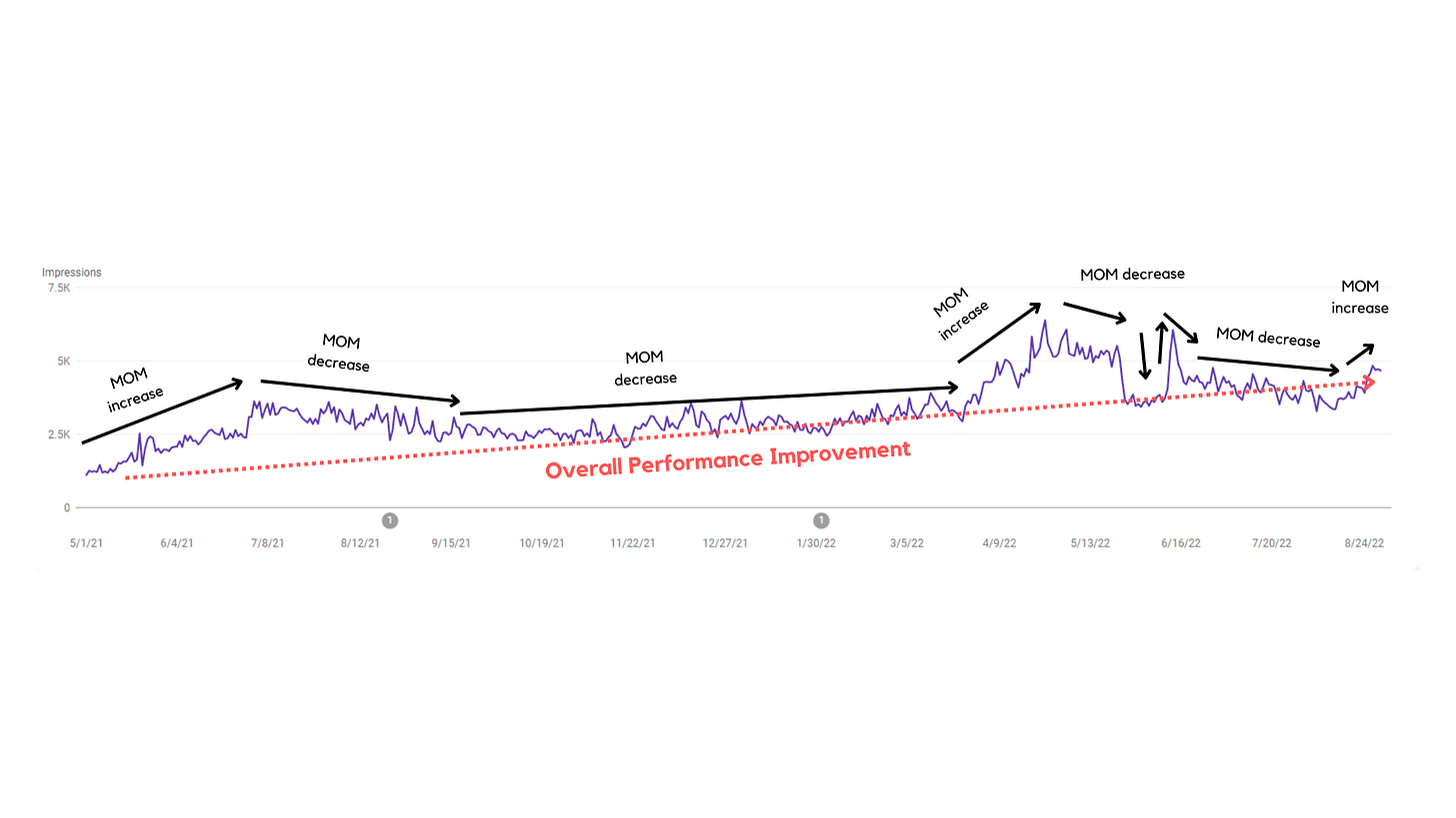 In SEO you can see a spike in MOM performance, then a drop in MOM performance and both are totally fine. A negative MOM in SEO does not necessarily mean you did something wrong nor does it mean you didn't execute. So what does MOM for SEO performance shows? That's exactly why I don't think it's an ideal way to measure SEO performance.