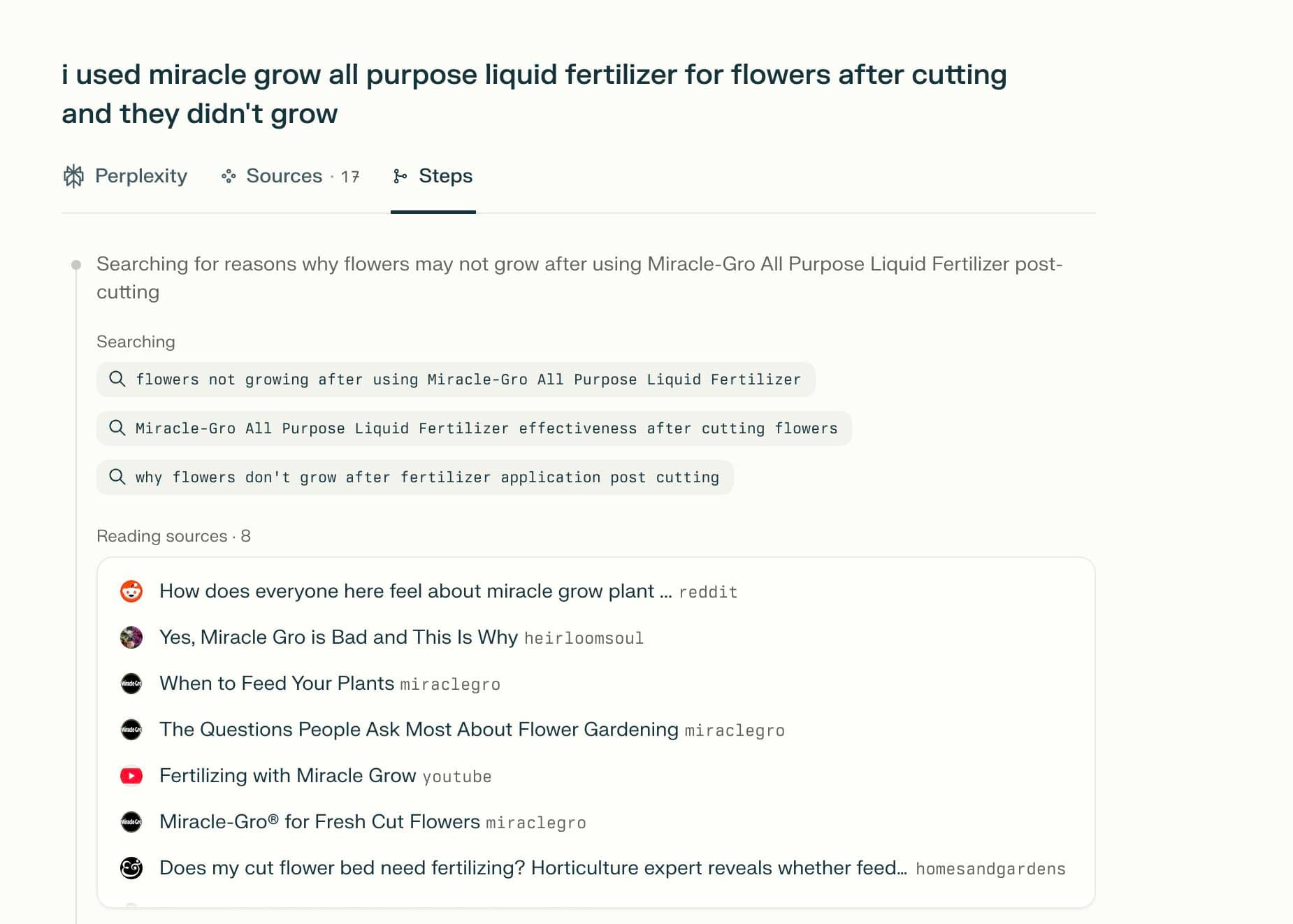 I got the answer I needed — but, being the SEO that I am, I clicked on the "Steps" tab to see how Perplexity generated the response. And what I saw looked a lot like query fan-out.