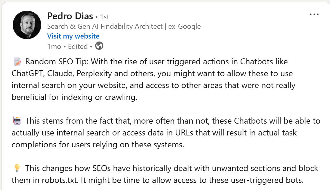 Make sure your content is accessible for LLMs. This aligns pretty much with an interesting tip shared by Pedro Diaz a while ago. Pedro recommends allowing LLMs to access site search pages!