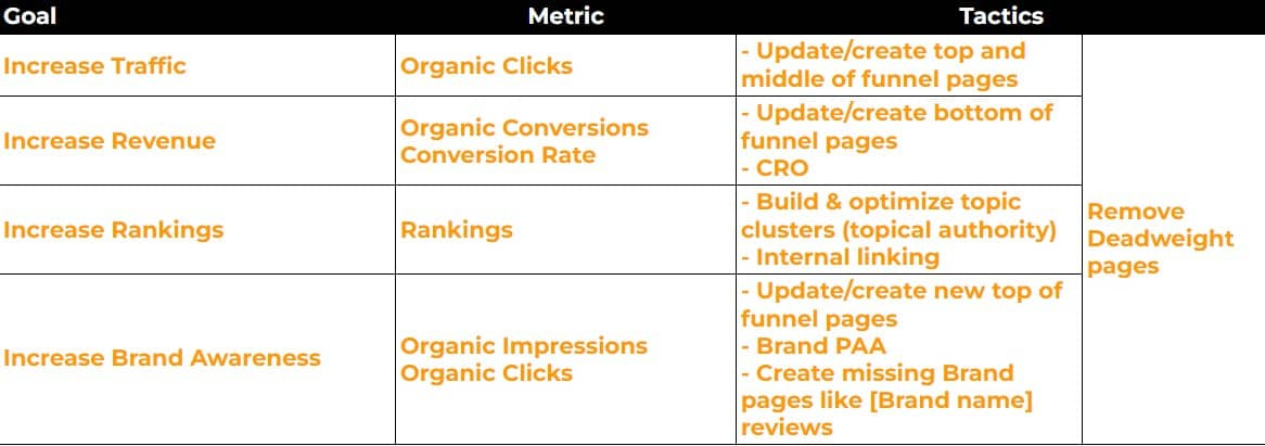Increase in Rankings: I've seen this before, and even recently an ecommerce client wanted to rank on page 1 for a specific type of keywords. I took on this client because they are an SEO company themselves so they understand how SEO works, but I'd be careful with taking on clients that have "rankings" as their main business goal. Anyways, if that's the business goal, your best bet is to build topic clusters and topical authority around the main keywords they want to rank for. This means: