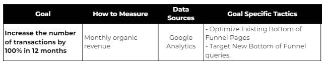 Increase Traffic: all websites want to increase traffic, but an increase in traffic isn't necessarily valuable to the business in terms of revenue. So traffic for the sake of traffic isn't useful unless it actually matters to the business. A publisher/blog type of websites for example that make revenue from affiliate links and ads may need plenty of traffic and it makes sense to their business model. An increase in traffic goal can be something like "30% increase in traffic YOY". This is the case where you need to focus on high search volume keywords (top and middle of funnel content).