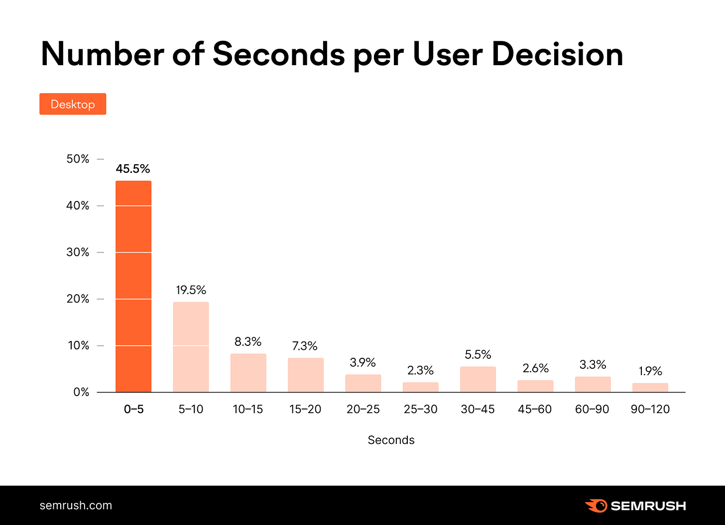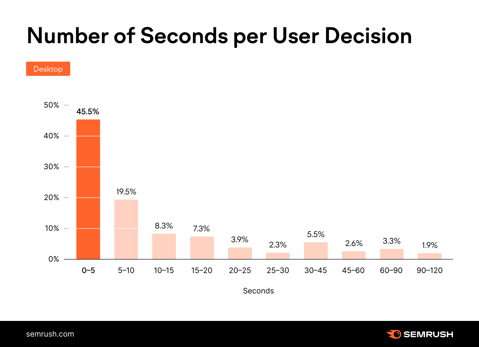 People are not spending a great deal of time analyzing the results, but are making quick decisions to get to what they want (graph below shows number of seconds the user takes to make a decision about their next step after the first search). This shows that, generally speaking, users are looking for quick answers, they're not spending a lot of time on the first page of SERPs analyzing results. ChatGPT definitely will feed into users' need to get to the answer they want faster.