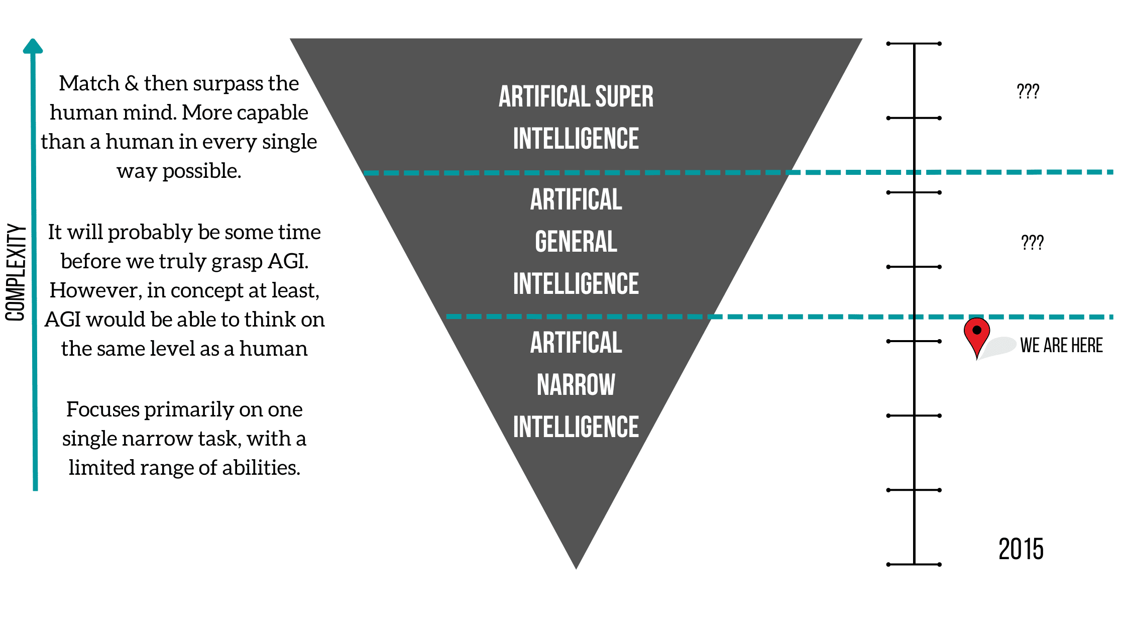 There are 3 types/species of AI. The one that is currently around is Artificial Narrow Intelligence. From its name, you can see that this type of AI has limited capabilities. Any ANI system focuses on 1 or 2 functional areas. It is not self aware or portray any self consciousness. ANI appears to be making decisions, but its the math and statistics that are running in the background. So the current version/level of AI does not match human capabilities yet.