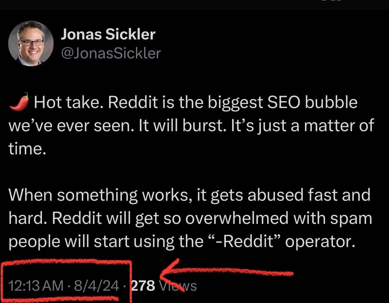 Some SEOs like Jonas Sickler have been saying "reddit is the biggest SEO bubble"...
