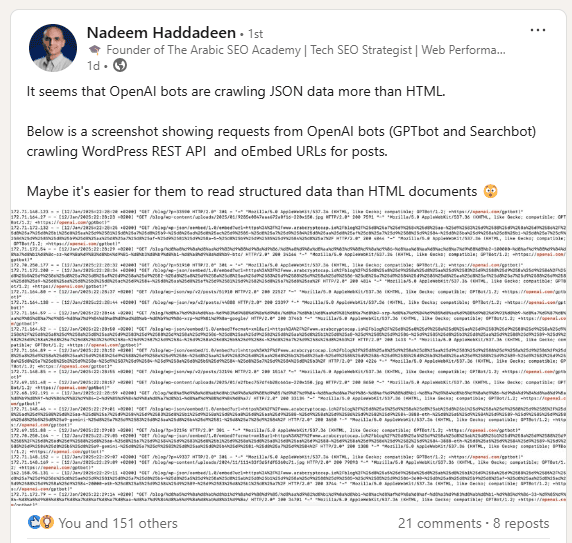 But sometimes answers come as a surprise! Nadeem Haddadeen on LinkedIn. Nadeem noticed that Open AI bots are crawling JSON data more than HTML.