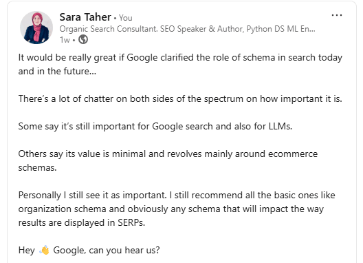The problem is, there has been a lot of chatter recently that we do not need schema nay more as LLMs can understand the content. Some individuals who have been known for their their experience on schema have also took this stand.
