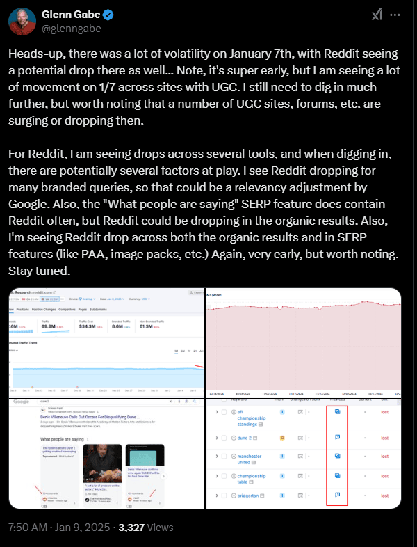 Ok so reddit was a bubble? should we stop optimizing for it and making it part of our SEO strategy? because we've been saying and hearing the opposite for a long while now specifically after the $60 Million deal with Google earlier in 2024. Luckily someone came to the rescue, Glen Gabe mentioned that on January 7th, there was notable volatility across sites with user-generated content (UGC), including Reddit. Reddit appears to have experienced drops in organic search rankings for branded queries, which could indicate a Google relevancy adjustment. Additionally, Reddit is seeing declines in SERP features like "What people are saying," People Also Ask (PAA), and image packs. While the findings are preliminary and require further investigation, this trend is worth monitoring.