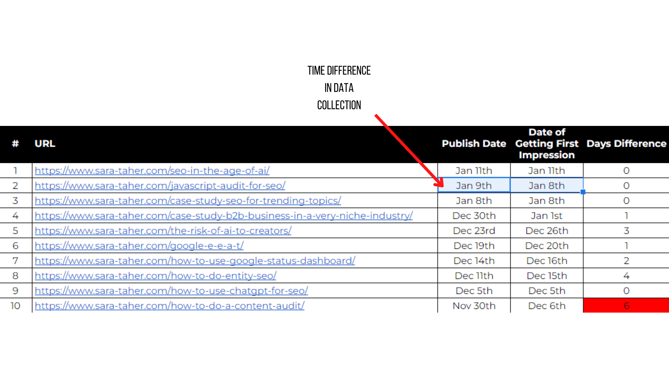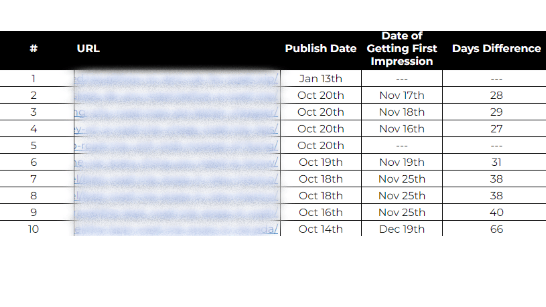 Going back to what John Muller mentioned above. I collected this data off my website. I compared publishing data against the date the URL started getting its first impression in GSC, here's how the data looks like for the last 10 articles published on my website: