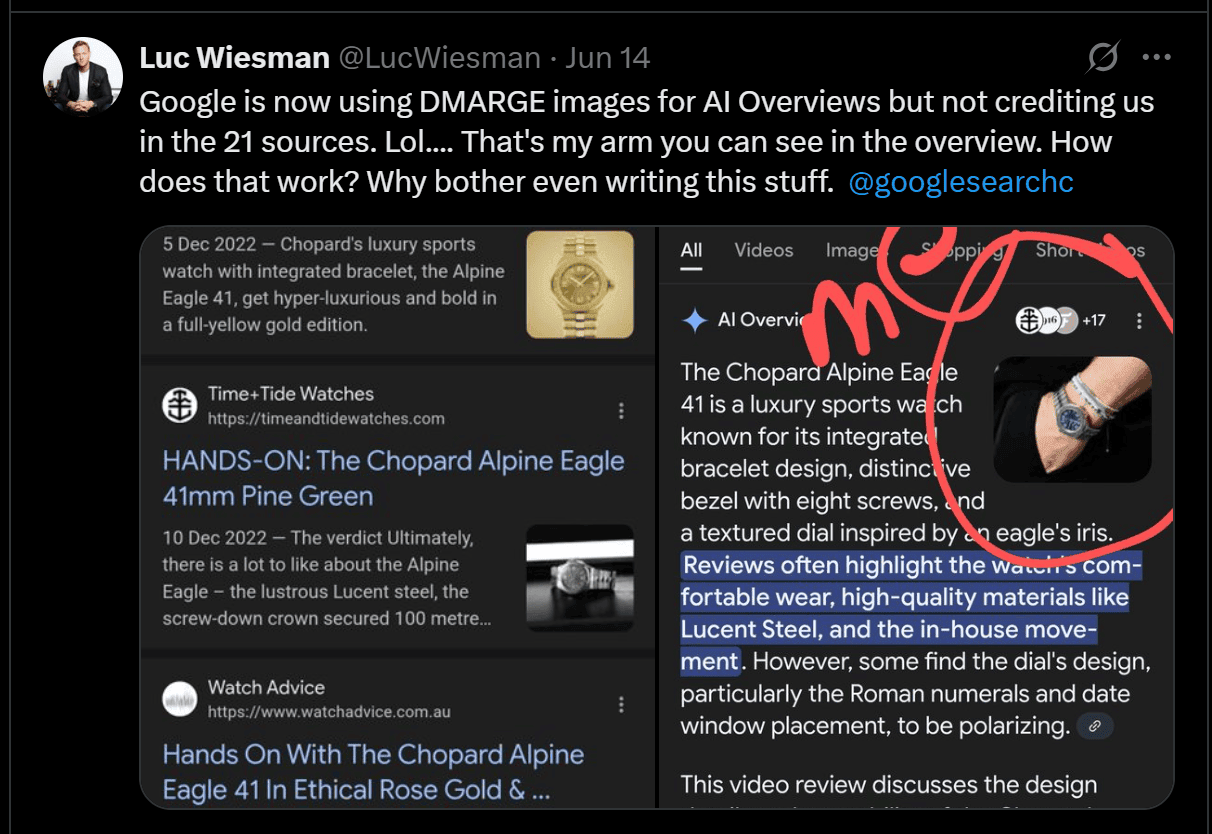 Interestingly, here's a tweet from  Luc Wiesman, the founder of DMarge, showing a screenshot where their content â in this case, even Lucâs arm â is used in AI overviews without giving DMarge any credit, why?