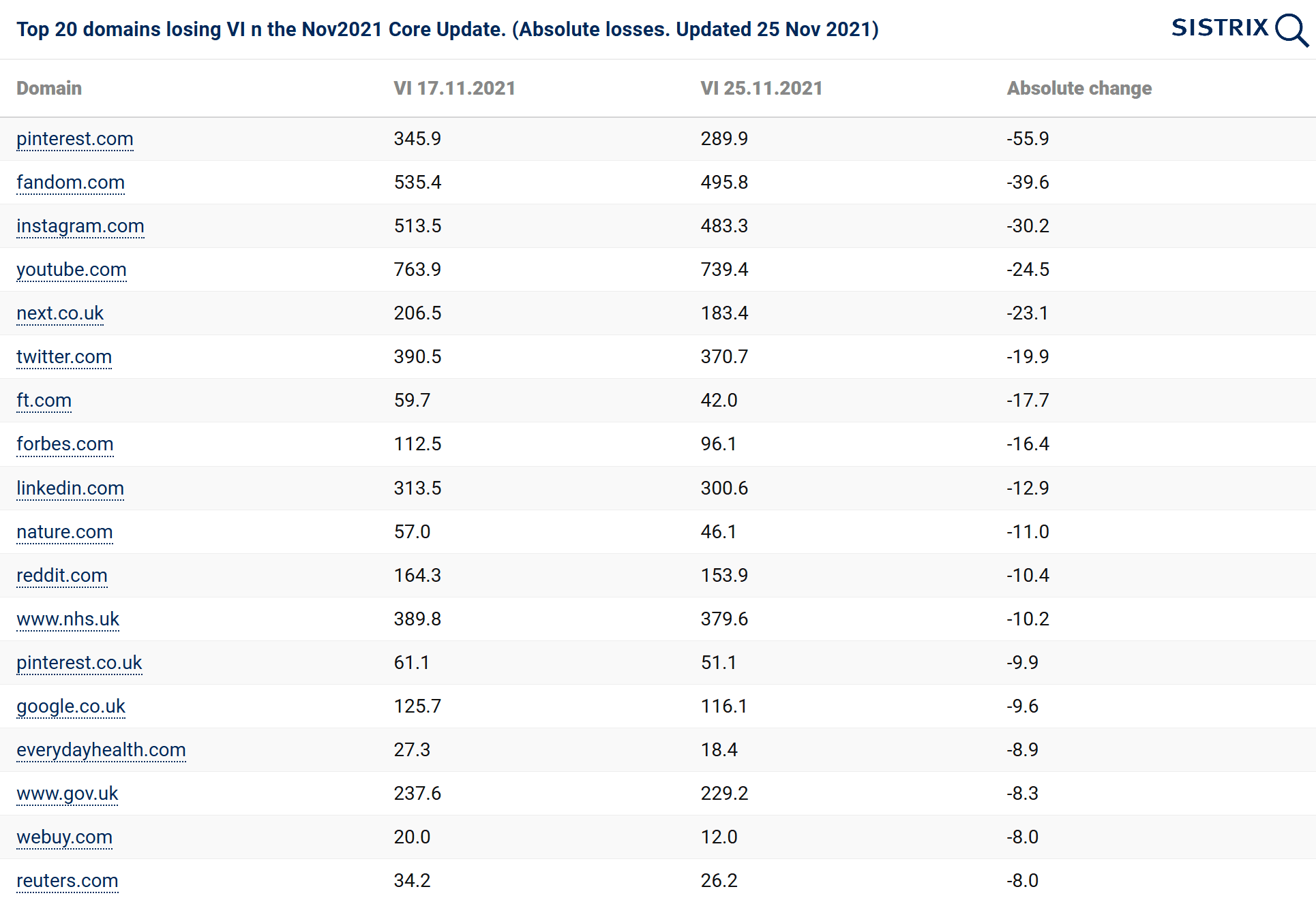 They mentioned the first time they noticed a decline (the start point) was with the November 2021 core update. This update rewarded reference websites like Wikipedia, but hit more websites specially socials like Pinterest, Instagram, even Youtube. Here's a list of top losers from Sistrix: