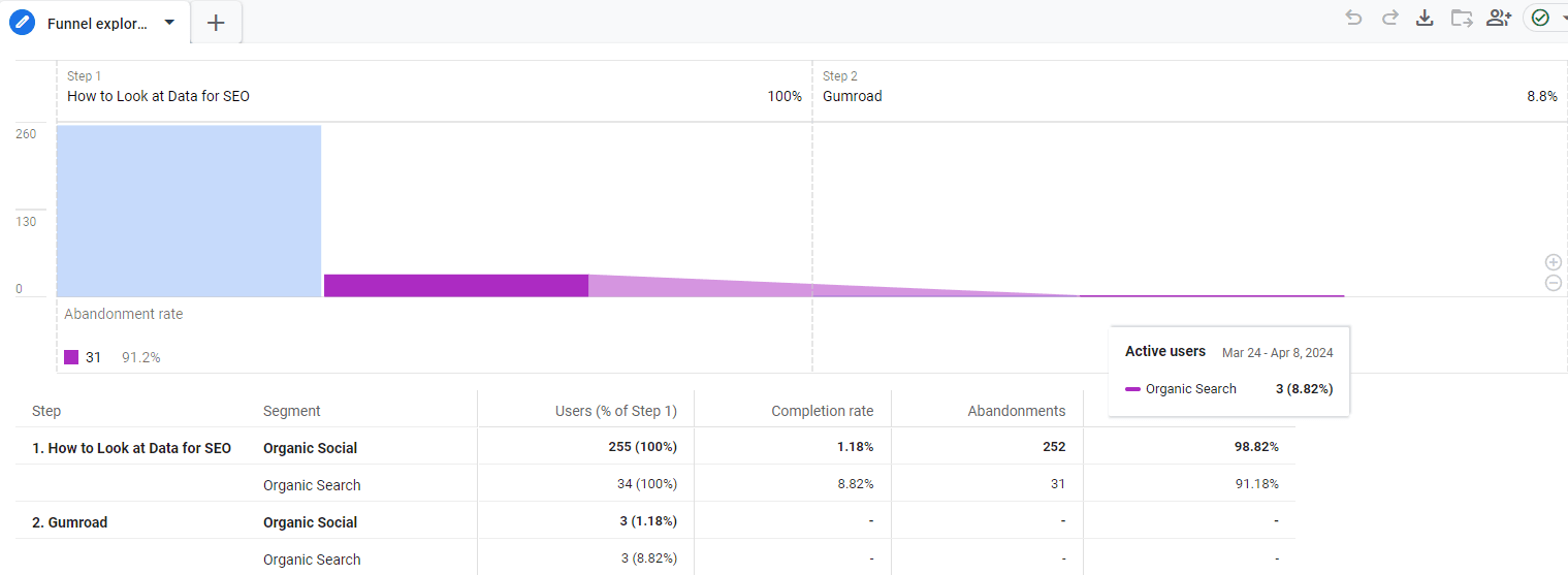 In the report above you can see for example that over 8% of people that landed on that blog from organic search checked my gumroad page, vs. 1.18% of users came from organic social.