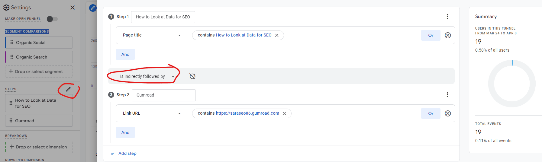 Now, let's create the funnel we want to explore! For my website, I decided I wanted to see how many users landed on "How to look at data for SEO" blog, spent some time on the website doing anything (note the "indirectly followed by" in the screenshot below) and then visited my gumroad page. To do this: