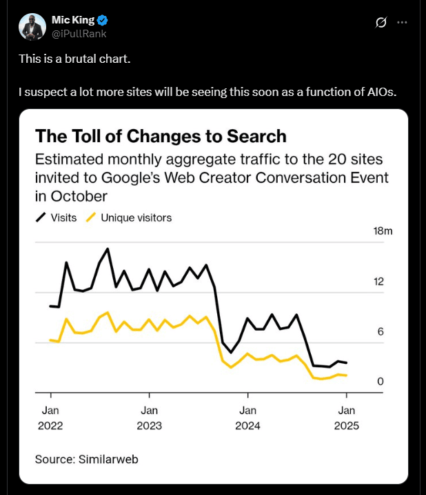 Mike King tweeted this graph from Similar web, which shows how AI Overviews impacted the 20 publisher sites that were invited to the disappointing event, the creators summit last October and it does not look good.