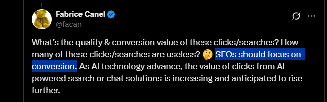Another thing we are used to hearing/reading is reassurances that AI is not going to hurt publishers and we shouldn't be worried. But Bing's Fabrice Canel took a different approach and suggest to us SEOs that we should focus our attention on conversions instead. What about publishers that rely on traffic for ads revenue?